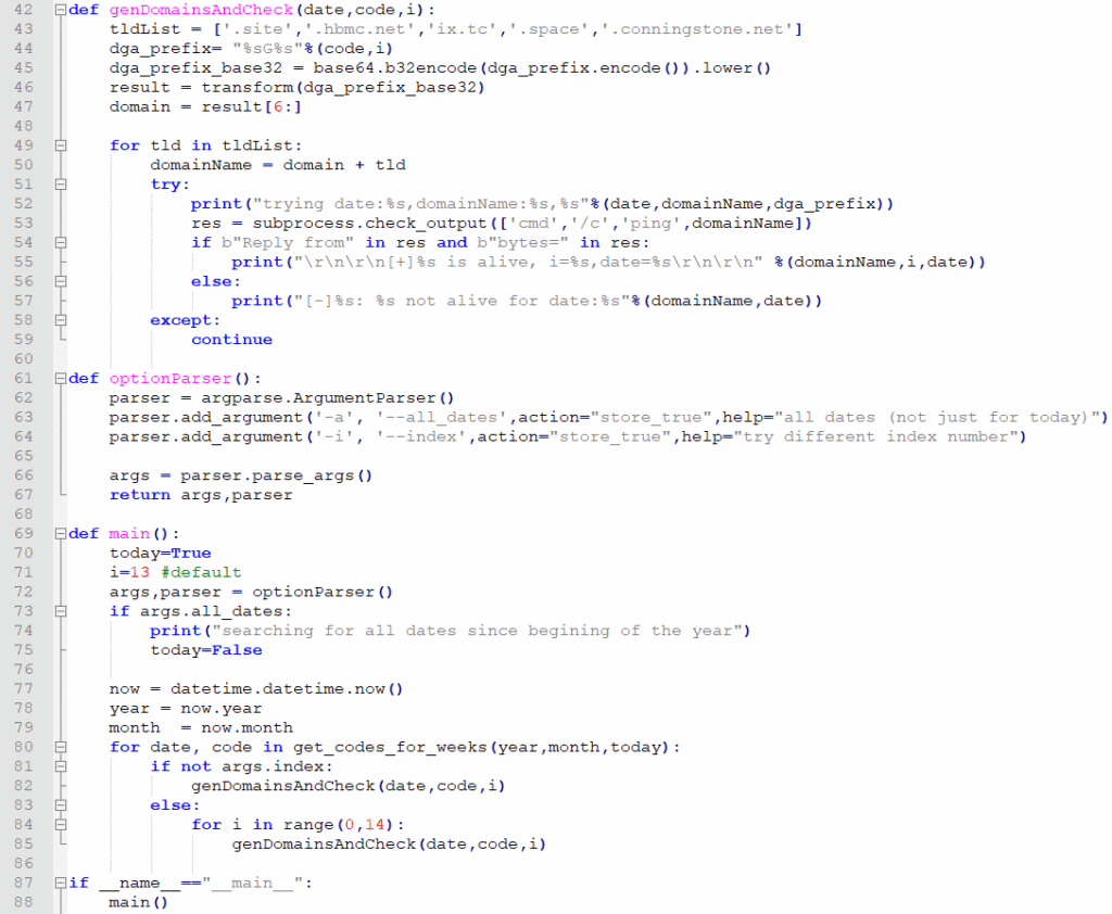 - The second phase takes the base32 DGA as input and transforms it using the custom ALPHABET “otdhpgaurxyvszmqlwckbfniej” + <tld>. tld is one of .site, .ix,tc, hbmc.net.\