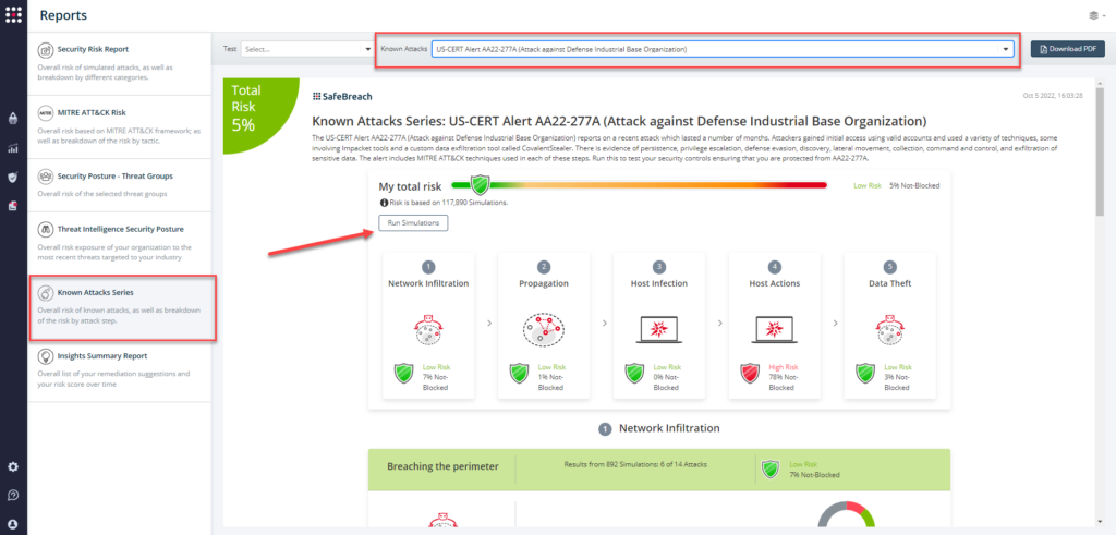 Attack methods related to US-CERT Alert AA22-277A are ready to run across your simulators. The Known Attack Series report has been updated so you can run the specific attacks from this US-CERT alert. From the Known Attack Series report, select the US-CERT Alert AA22-277A (Attack against Defense Industrial Base Organization) report and select Run Simulations, which will run all attack methods.