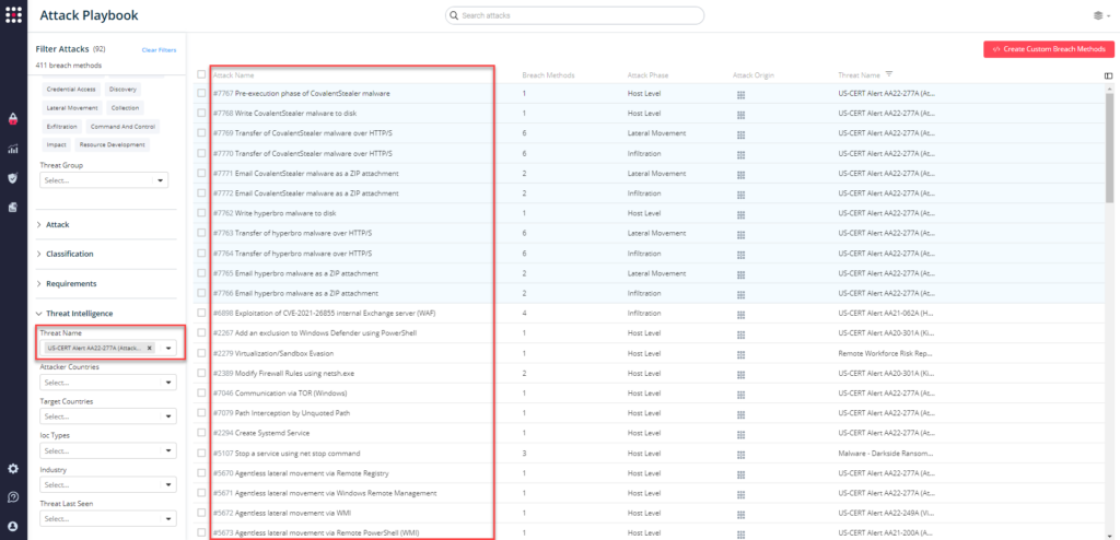 You can also select all the attacks related to US-CERT Alert AA22-277A by going to the SafeBreach playbook and filtering by Threat Name – US-CERT Alert AA22-277A (Attack against Defense Industrial Base Organization).