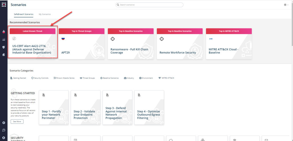 You can also go to the “SafeBreach Scenarios” page and choose the US-CERT Alert AA22-277A (Attack against Defense Industrial Base Organization) scenario from the list of available scenarios.
