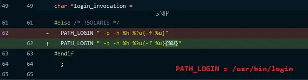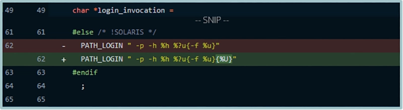 The insertion of %U is located in the file telnetd.c from lines 49 to 63 and adds a new option (%U) to the “formatting template” of a constant named “login_invocation”.