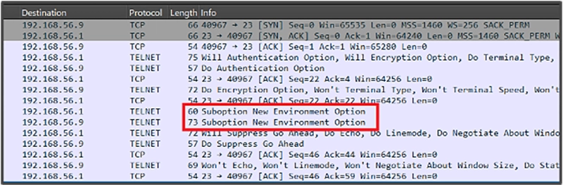 The Telnet protocol enables the user to send a sequence of Telnet commands, which results in the setting of the USER environment variable, this environment variable is used to pre-fill the username used in the authentication (autologin). The marked SUBOPTION packets are the final exchange of the user-supplied environment data: