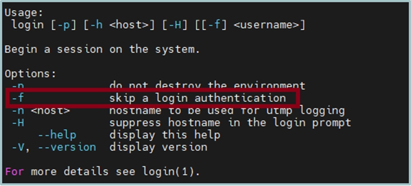 So, this means we can supply new flags or arguments for the /usr/bin/login executable.Looking at the flags available for use in the login binary, there seems to be a very powerful option that we can leverage: