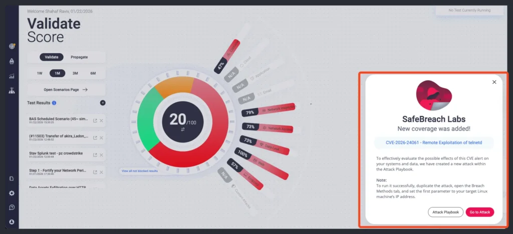 • From the SafeBreach homepage, customers can select “Go to Attack” in the CVE-2026-24061 New Coverage pop-up.