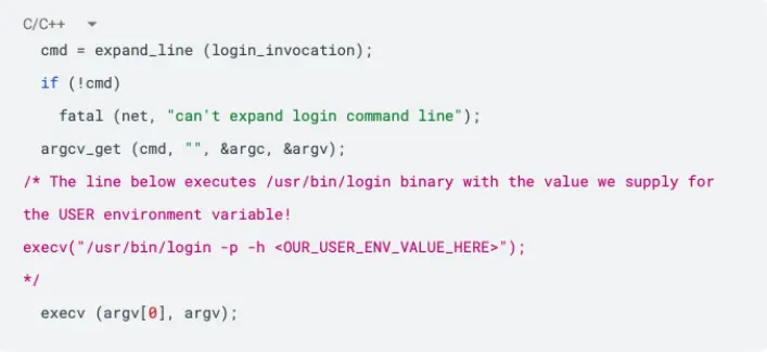 In order to understand why this change is problematic, we will examine how Telnet operates. When a user uses Telnet remotely, it must start by authenticating. To accomplish this authentication, telnetd utilizes an already existing executable in Linux that implements this logic – /usr/bin/login, which is responsible for authenticating the user and creating a session that gives them an interactive shell.