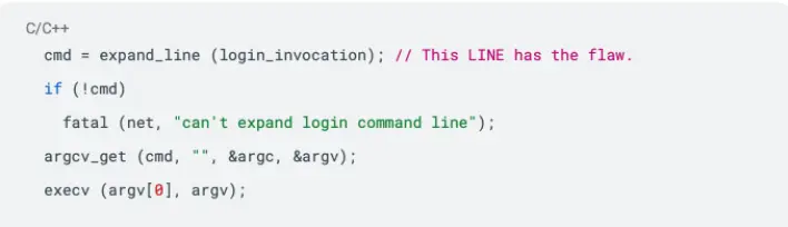 • We see a construction of a string that looks like a command-line that executes /usr/bin/login with arguments. It appears: